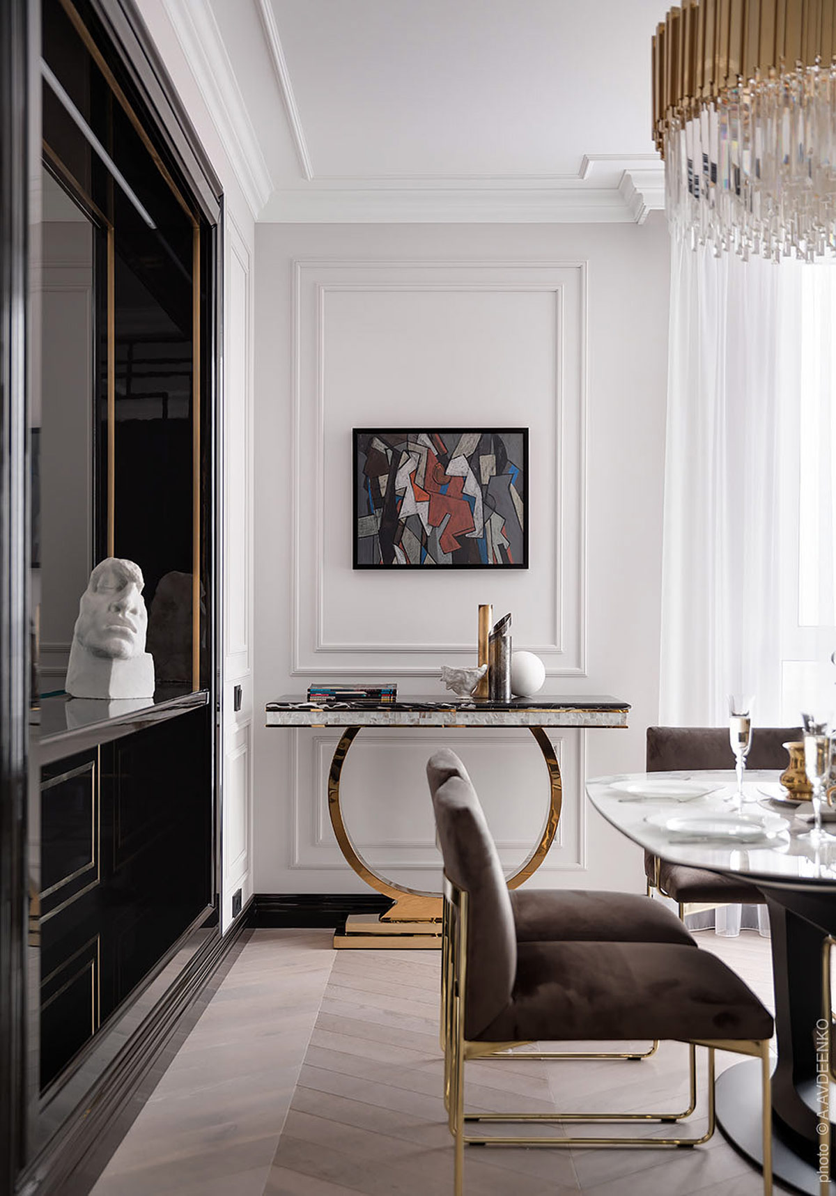 餐廳盡頭的金色大理石控制臺(tái)桌引起了人們的注意,在那里它引起了人們對(duì)彩色墻壁藝術(shù)的注意。