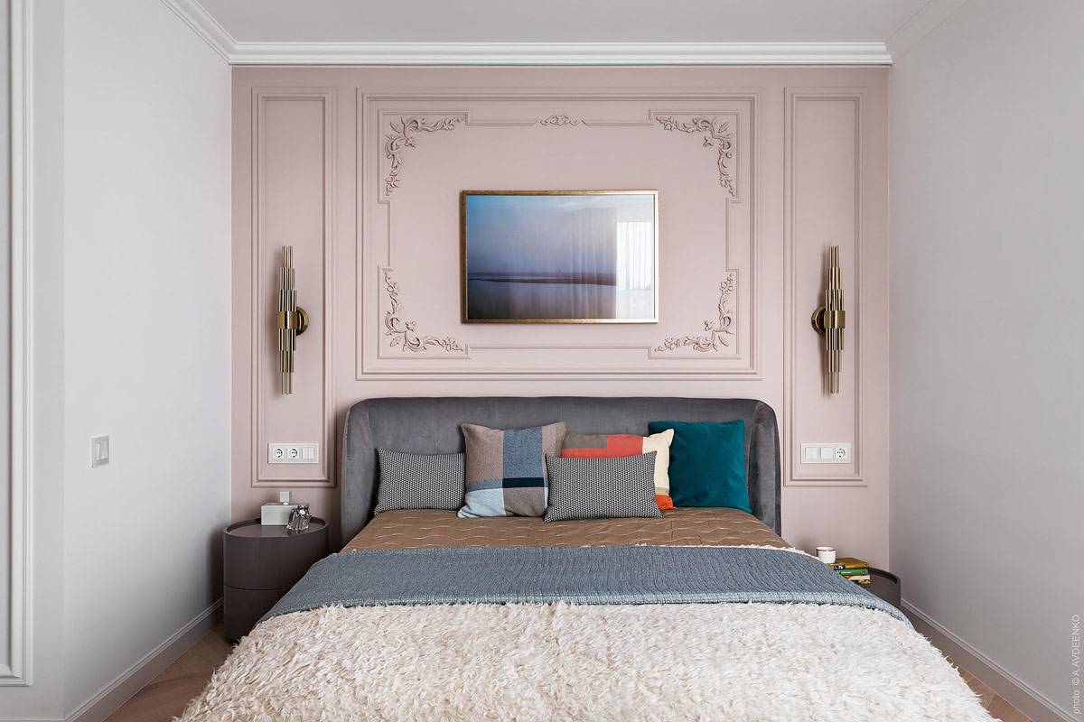 在粉紅色的臥室內(nèi),一對(duì)裝飾藝術(shù)風(fēng)格的壁燈位于軟墊床的兩側(cè),還有一瞬間美麗的木墻細(xì)節(jié)。