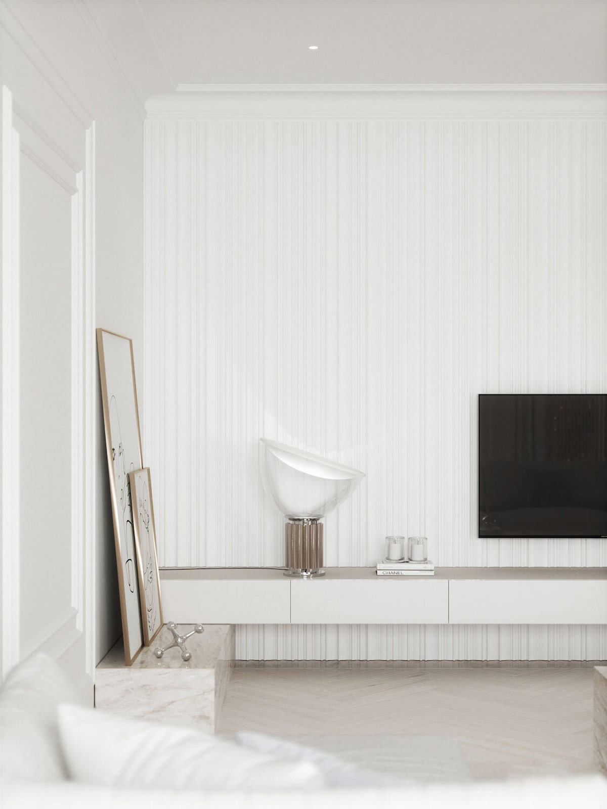 同心面板成型為純白色墻壁增添了大面積的趣味,同時(shí)還帶有一絲新古典主義的優(yōu)雅。