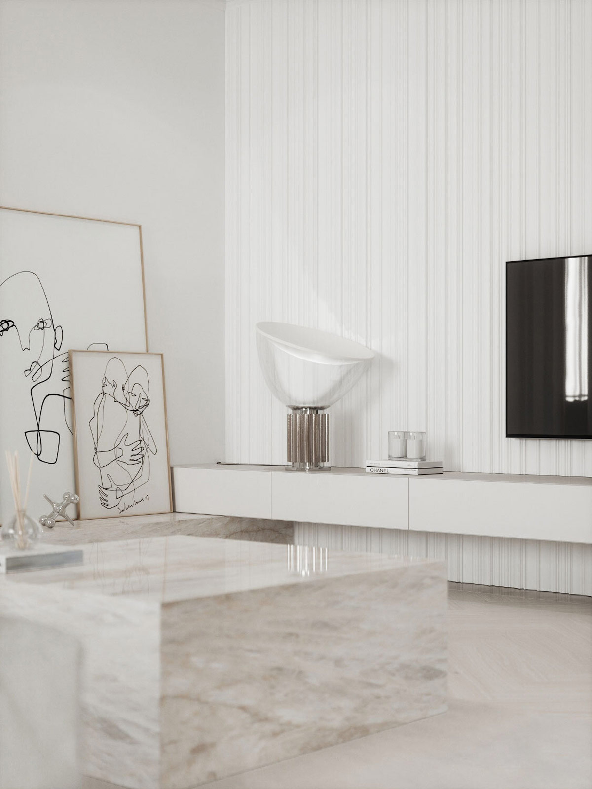 這件藝術(shù)品優(yōu)雅地懸掛在大理石底座上,與現(xiàn)代線性電視單元形成了一個(gè)互鎖的部分。