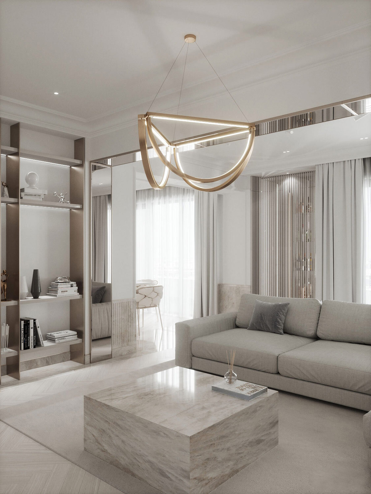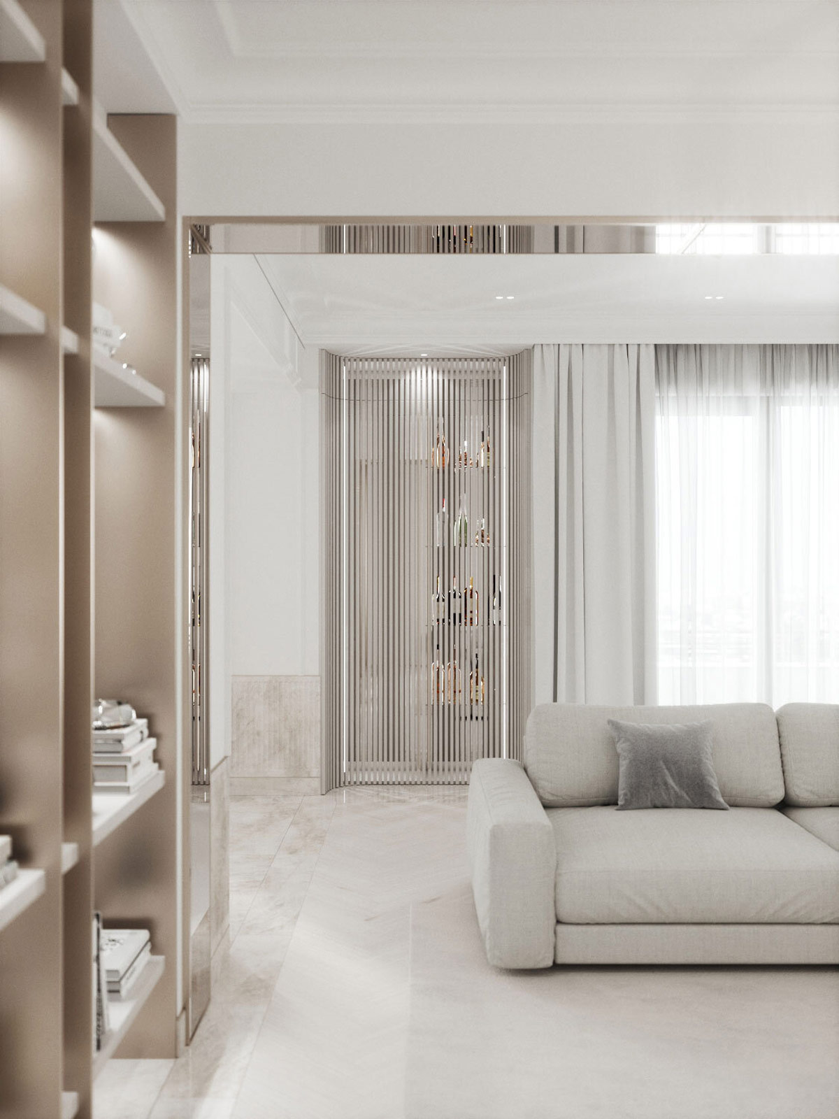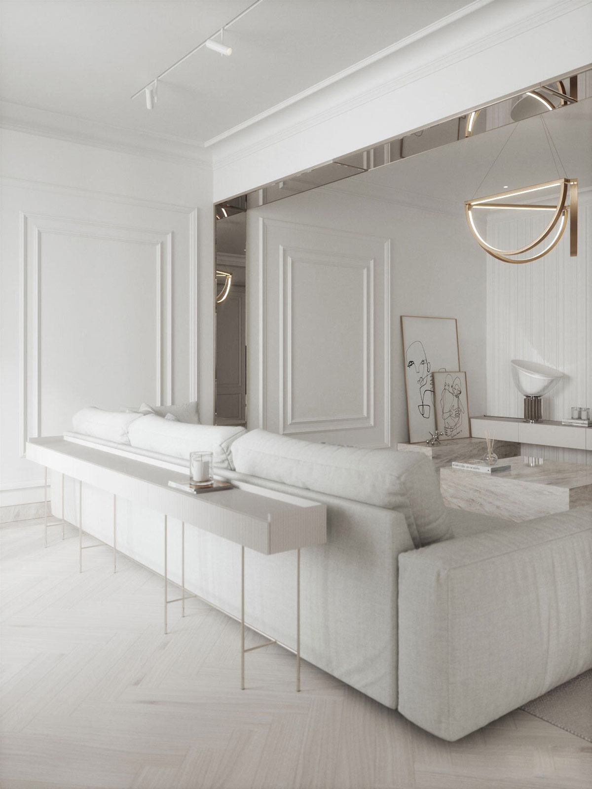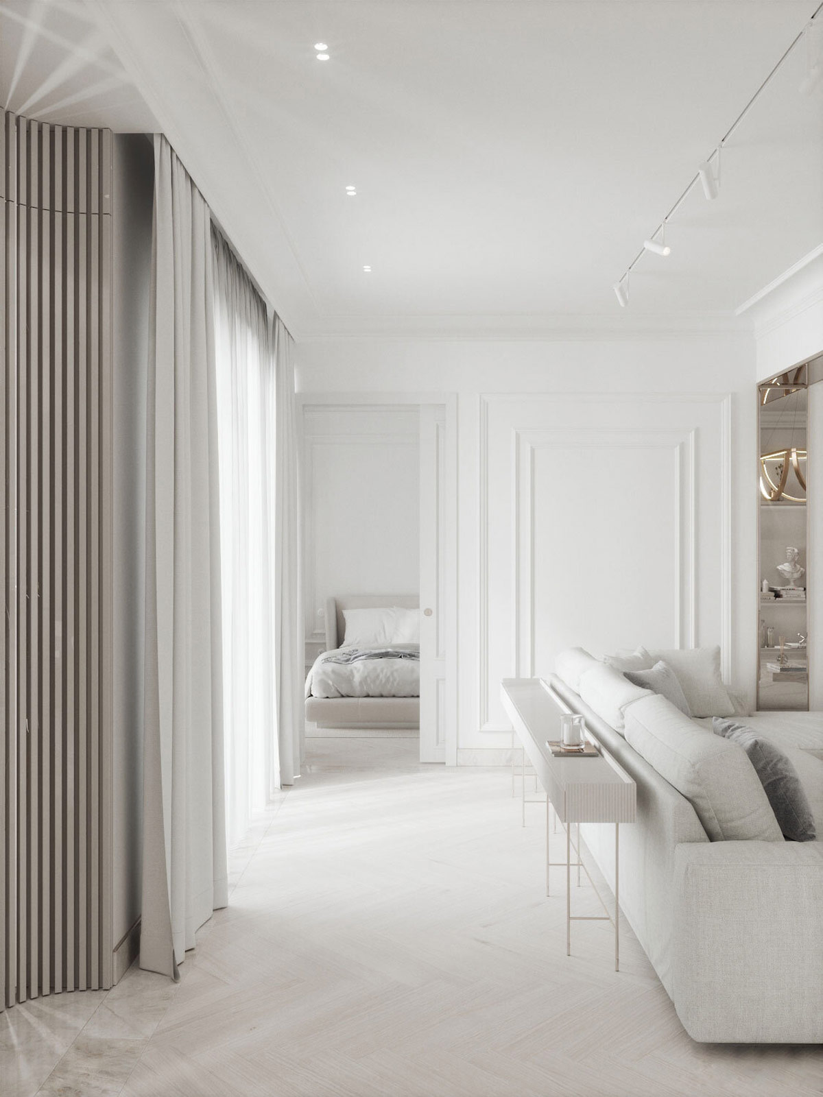 這個(gè)公寓項(xiàng)目采用輕盈奢華的白色內(nèi)飾,配有鏡子、金屬和光滑的大理石裝飾,是一個(gè)充滿精致裝飾品和引人注目的現(xiàn)代線條藝術(shù)的高端住宅。香檳金飾面為冰白色背景增添了一絲溫暖,而淺灰色的耳語則引入了微妙的陰影。奢華的浴室設(shè)計(jì)在美妙的粉紅色色調(diào)墻下進(jìn)入色彩領(lǐng)域,其中的甜美被沉重的黑色元素抵消。查找包含在家庭參觀結(jié)束時(shí)的完整平面圖。