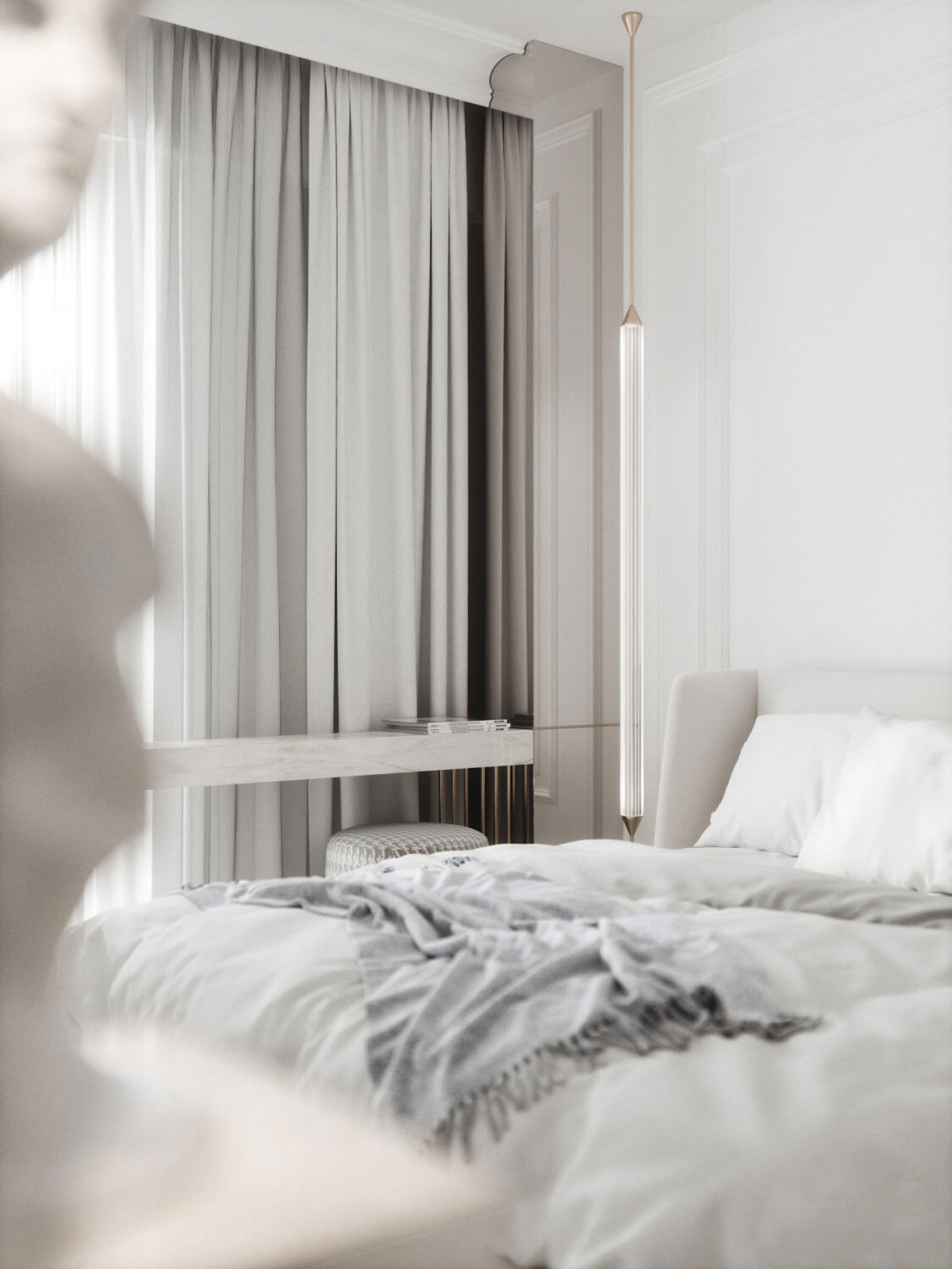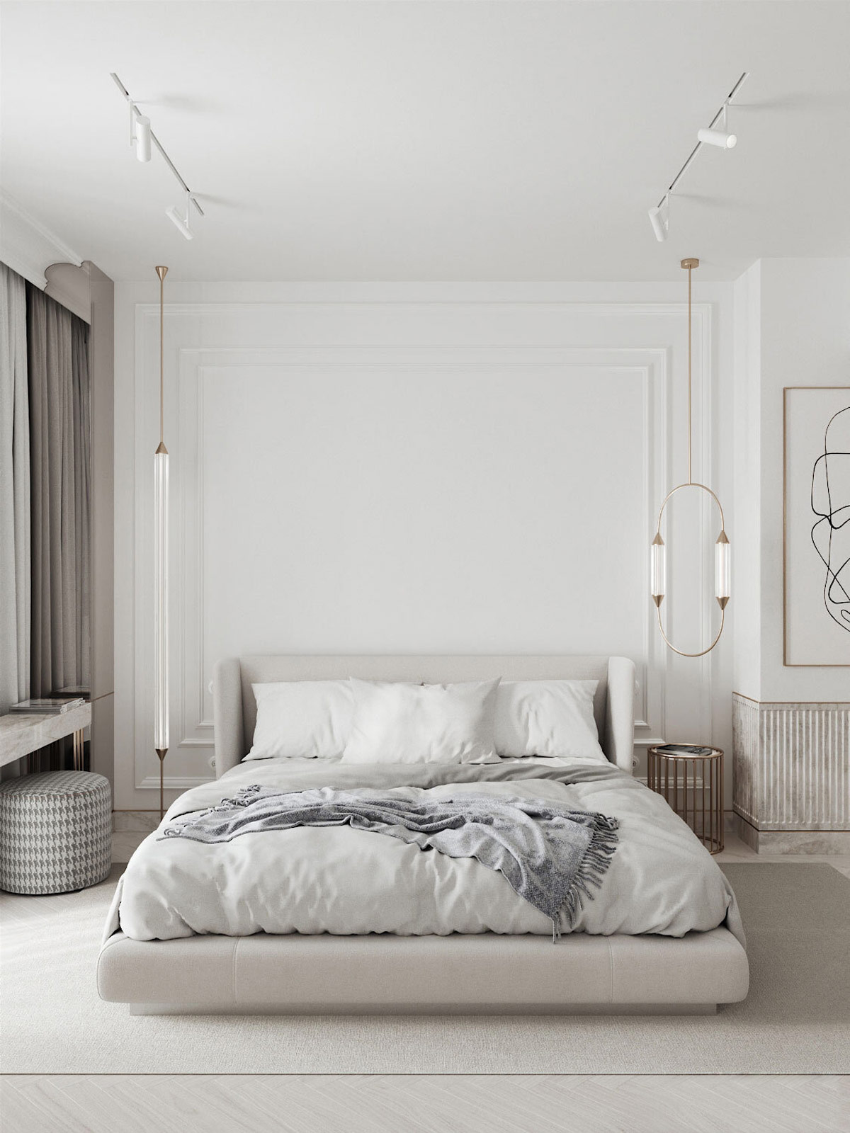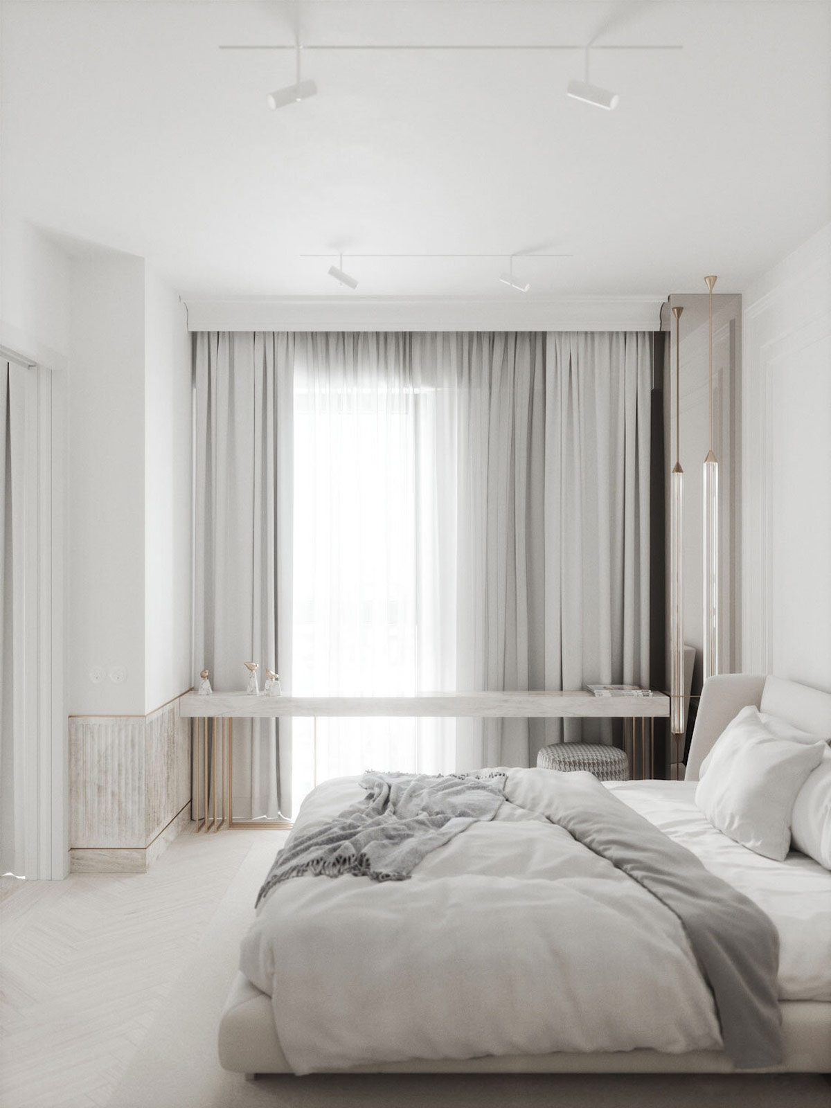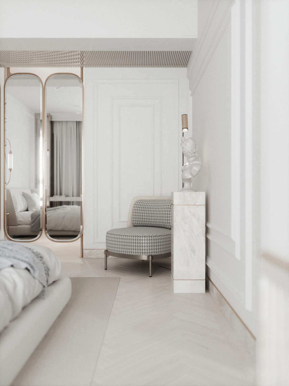 這個(gè)公寓項(xiàng)目采用輕盈奢華的白色內(nèi)飾,配有鏡子、金屬和光滑的大理石裝飾,是一個(gè)充滿精致裝飾品和引人注目的現(xiàn)代線條藝術(shù)的高端住宅。香檳金飾面為冰白色背景增添了一絲溫暖,而淺灰色的耳語則引入了微妙的陰影。奢華的浴室設(shè)計(jì)在美妙的粉紅色色調(diào)墻下進(jìn)入色彩領(lǐng)域,其中的甜美被沉重的黑色元素抵消。查找包含在家庭參觀結(jié)束時(shí)的完整平面圖。