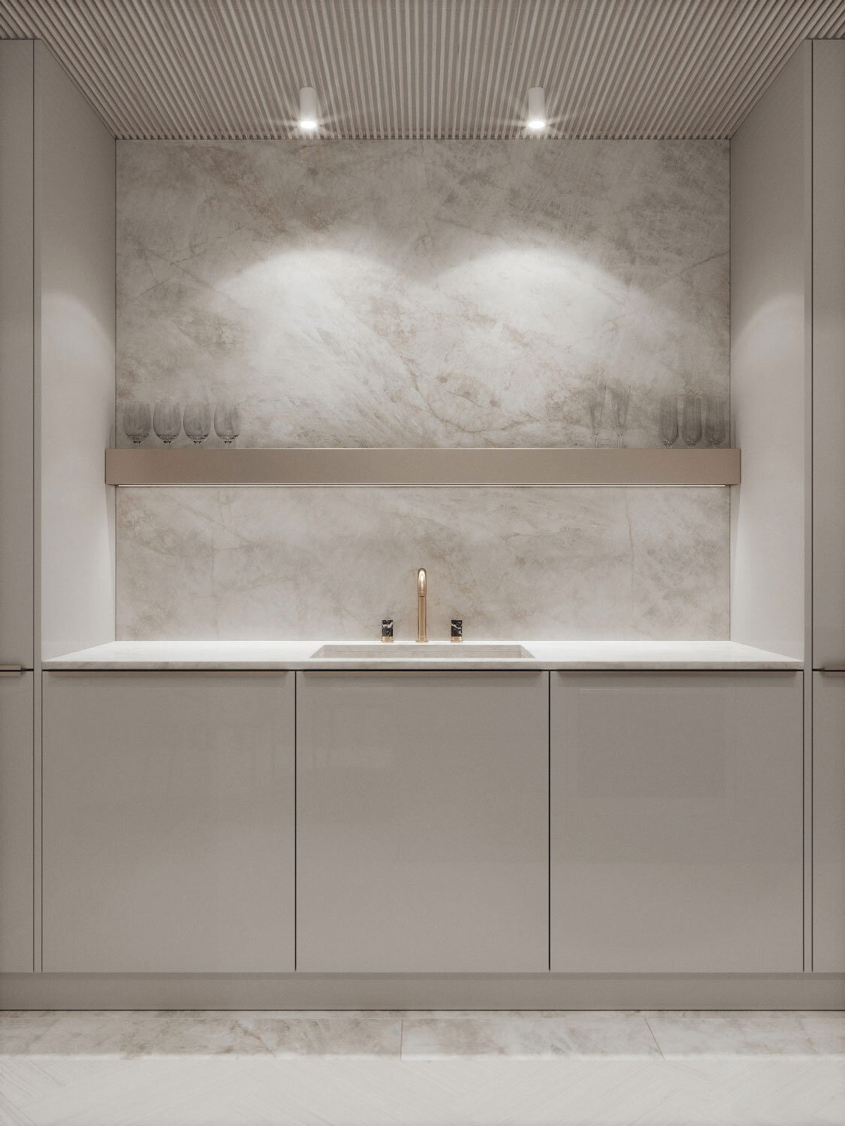 休息室直通豪華廚房空間,廚房島臺與美麗的懸臂餐桌表面融為一體。香檳金現(xiàn)代餐椅與奢華的白色絎縫靠背交織在一起。