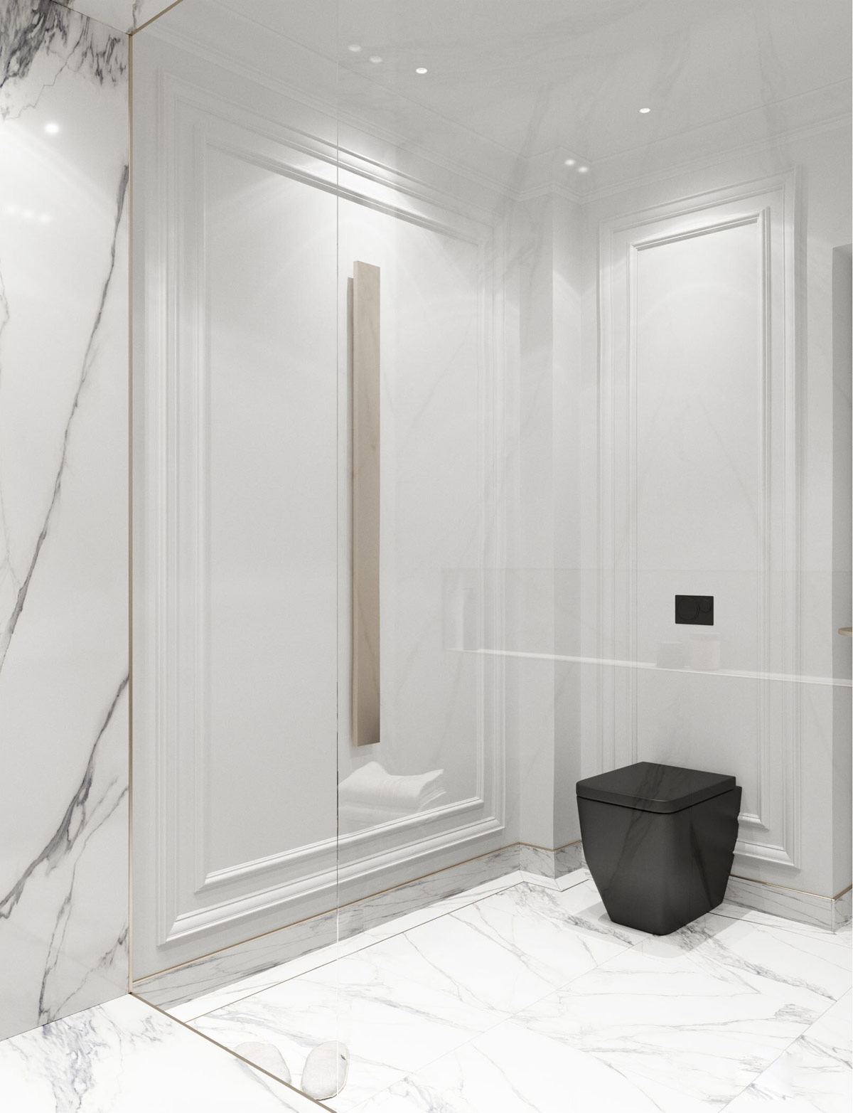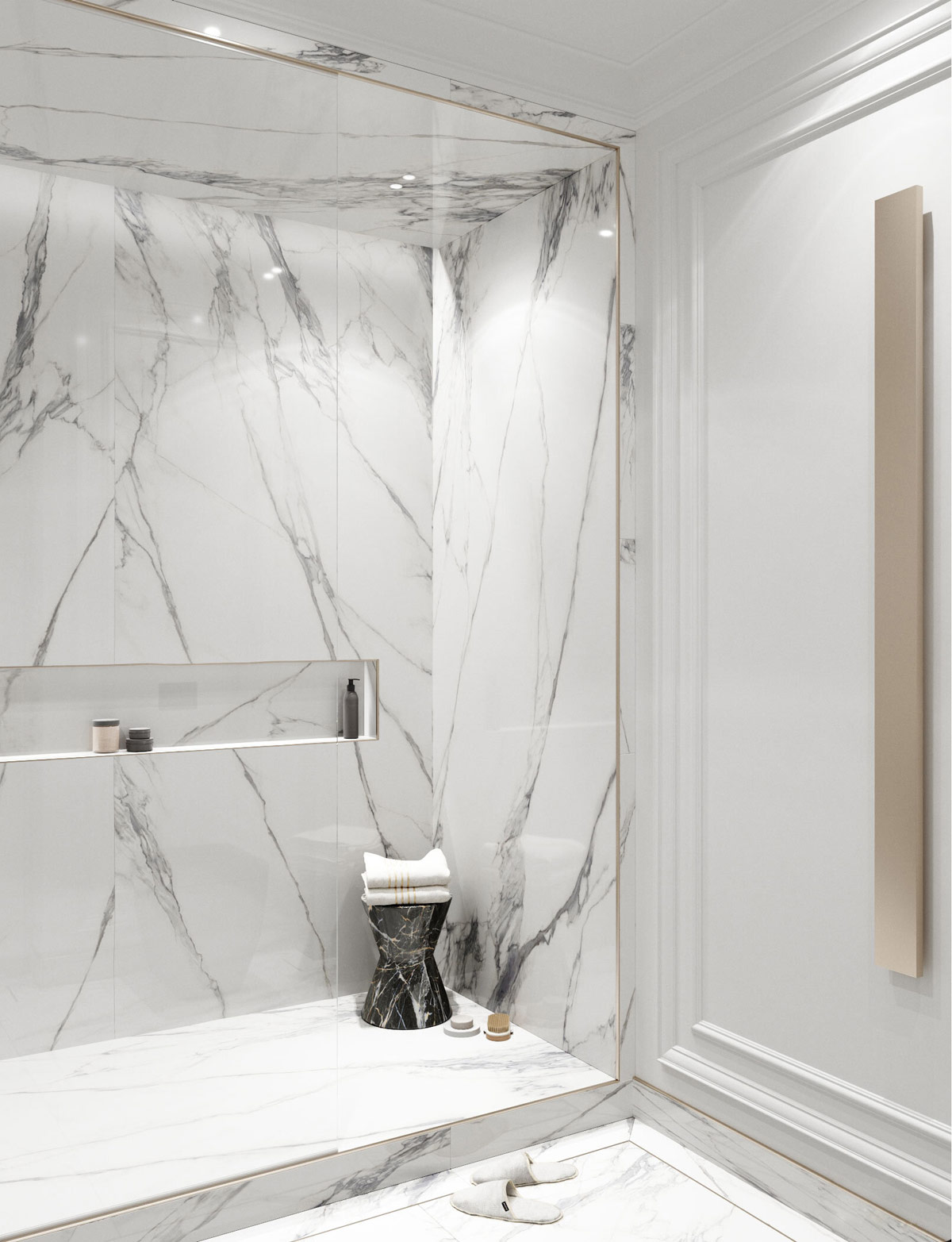 大片的白色大理石和雷鳴般的灰色紋理包裹著浴室。