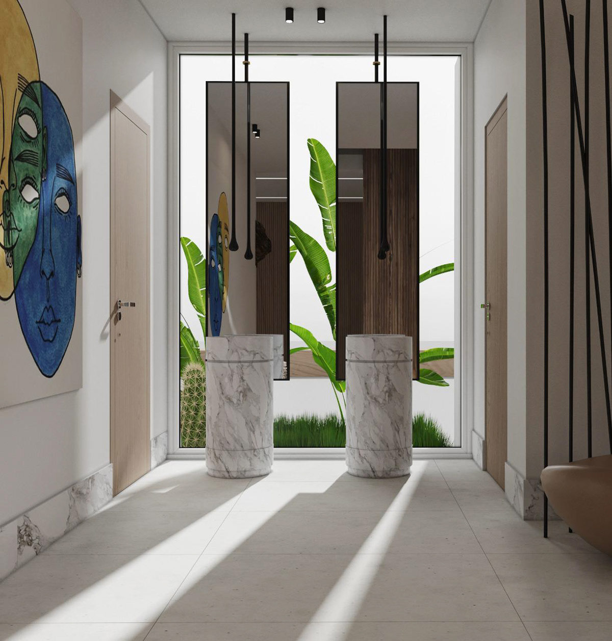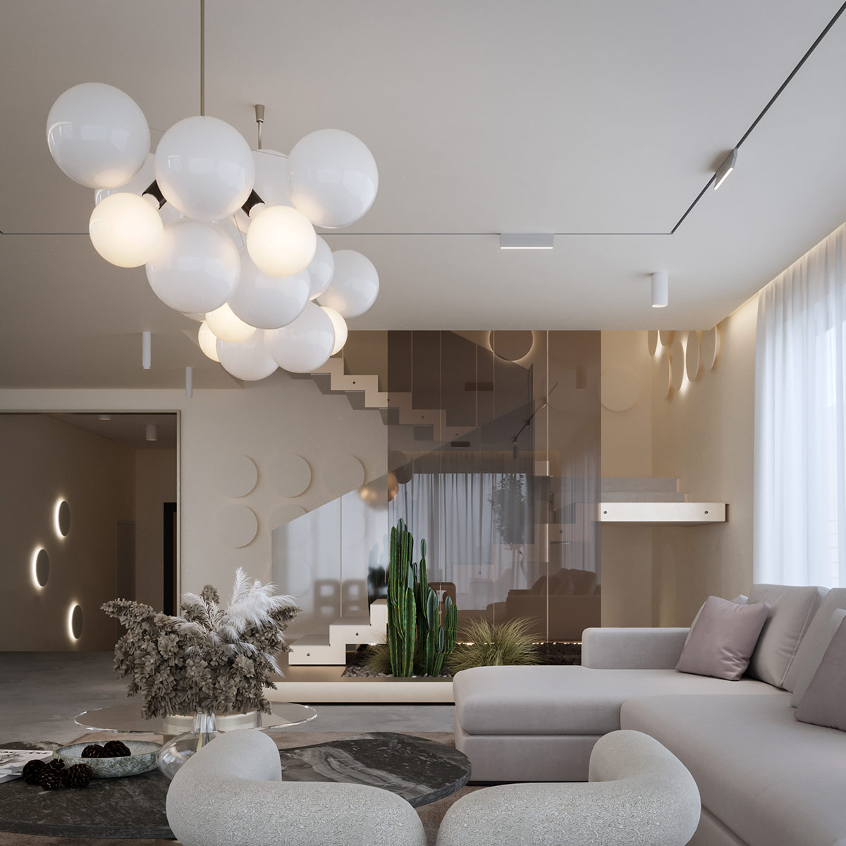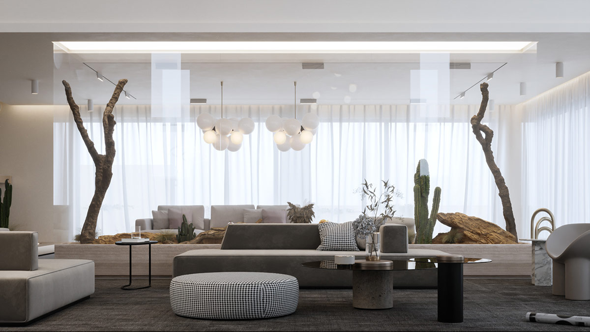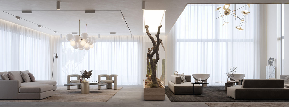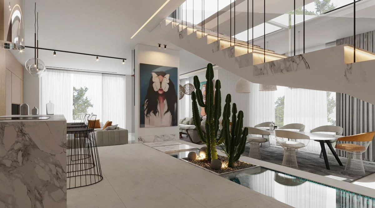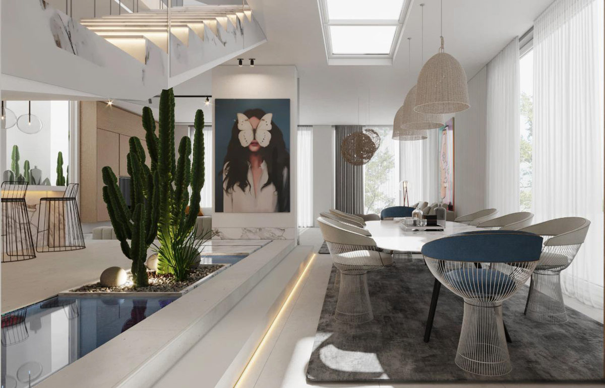 室內(nèi)庭院為這兩個豪華的現(xiàn)代室內(nèi)設(shè)計增添了綠色植物,現(xiàn)代樓梯在其中穿出奢華和優(yōu)雅的線條。庭院是小而干旱的設(shè)計,成熟的仙人掌以高大而迷人的形式統(tǒng)治。家居設(shè)計第一還為家庭寵物提供了一個中央玻璃容器,完成了一個美麗而實用的聲明。第二個特色住宅的庭院為室內(nèi)倒影池提供了靈感,該池由豪華的白色大理石墊腳石穿過,兩側(cè)是引人注目的現(xiàn)代藝術(shù)。在每個家庭中,我們都會發(fā)現(xiàn)鼓舞人心的樓梯,這些樓梯通過透明的玻璃欄桿展示出它們的全部美感,在柔和的氛圍照明下突出顯示。