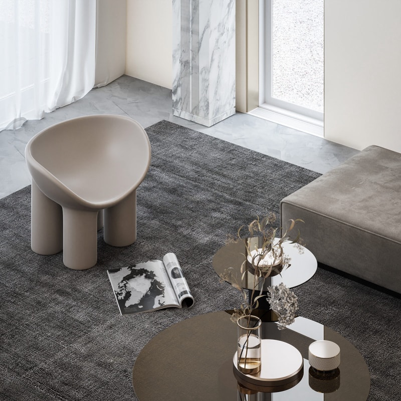 一張圓形的奧斯曼咖啡桌將黑白圖案注入休息室的中心。相配的散布靠墊為純灰色現(xiàn)代沙發(fā)增添了風(fēng)格。