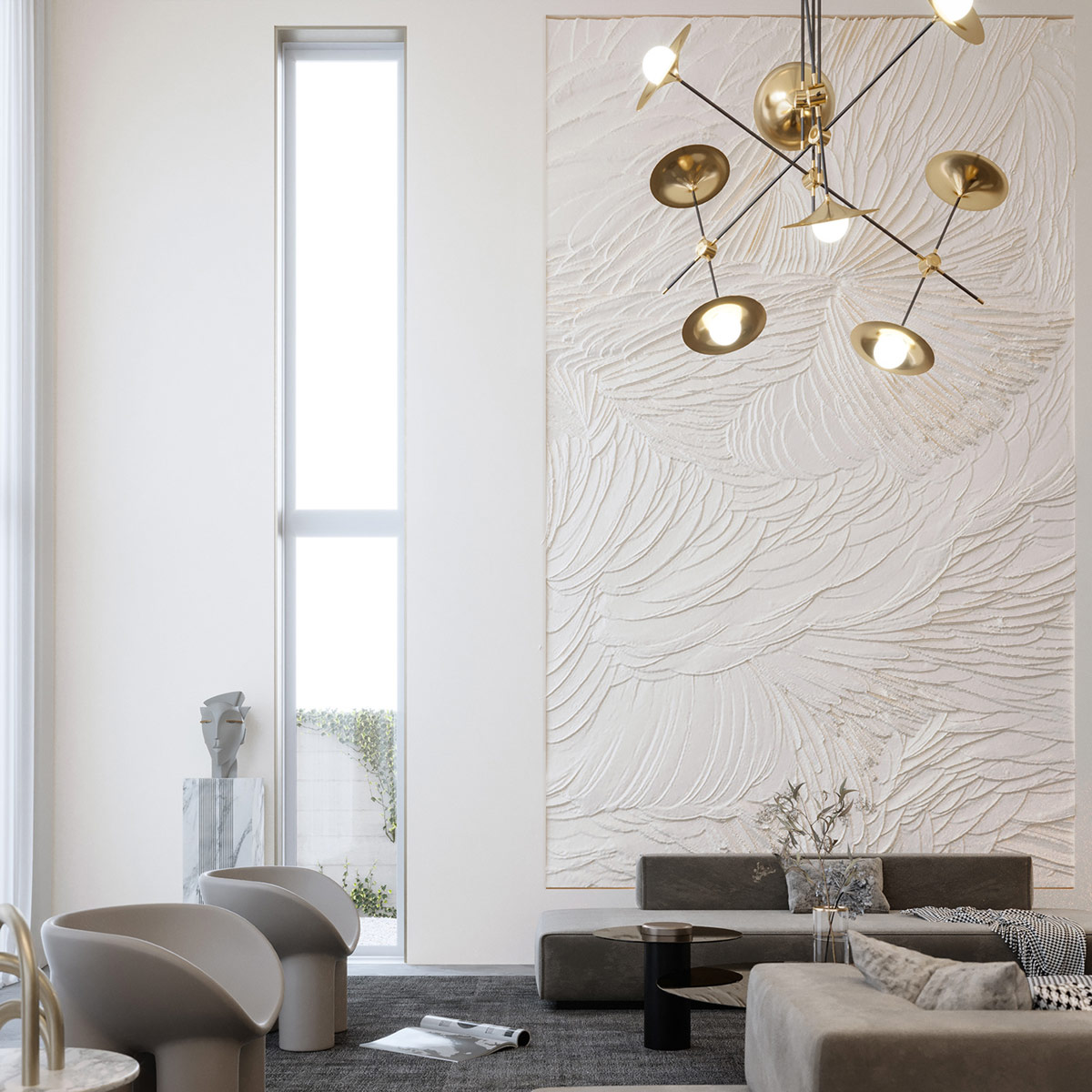 引人注目的現(xiàn)代枝形吊燈將明亮的黃銅色調(diào)融入灰色和白色的裝飾方案中。