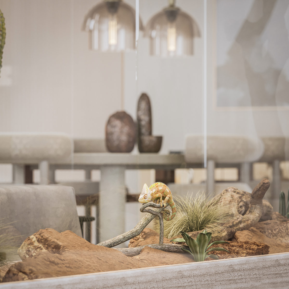 一只寵物變色龍懶洋洋地探索中央玻璃容器,在那里他可以密切注視著生活空間的每一邊。