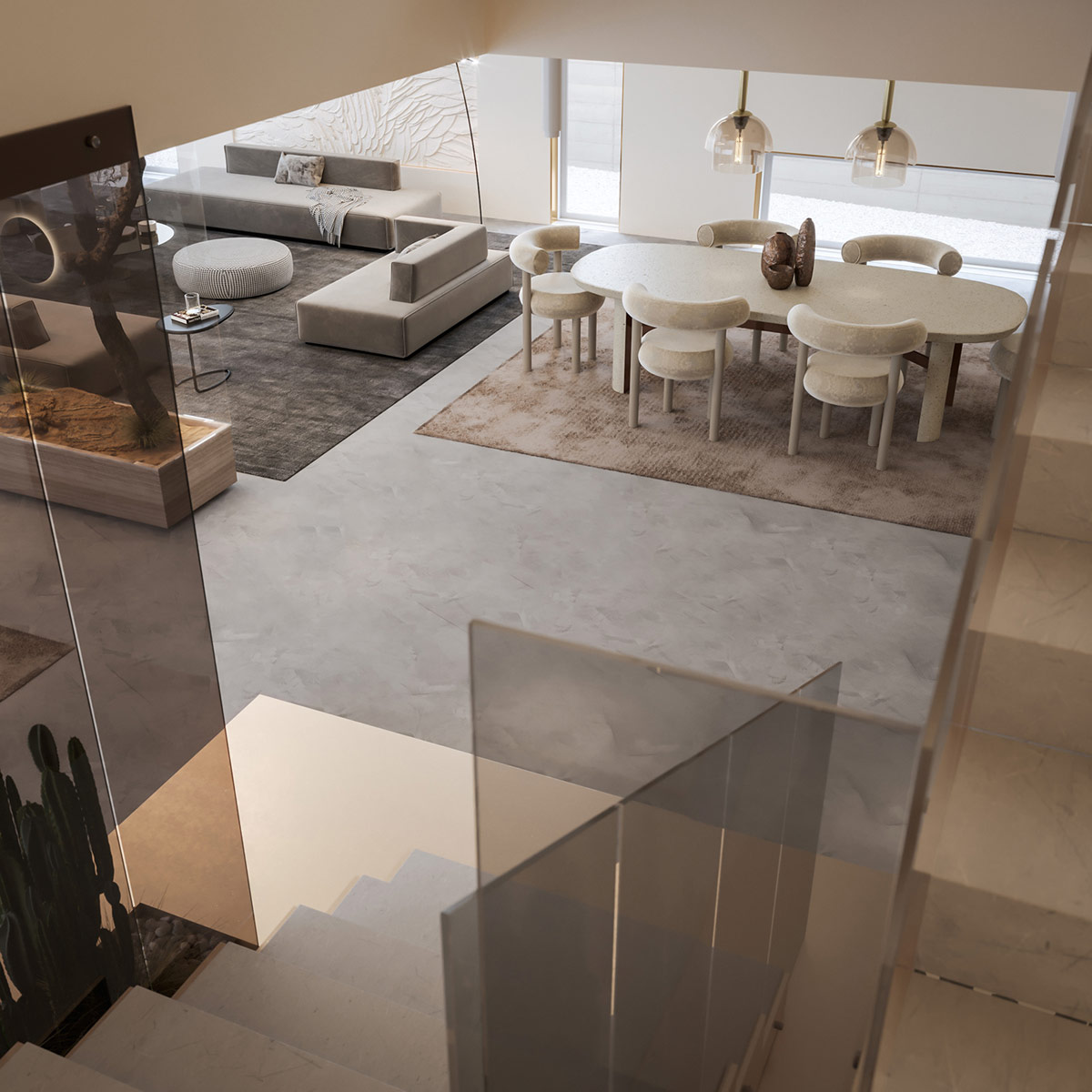 大客廳通向帶有透明玻璃欄桿的現(xiàn)代樓梯。樓梯間底部裝飾著一個干燥的小庭院,增添了令人振奮的綠色植物、質(zhì)地和自然趣味。