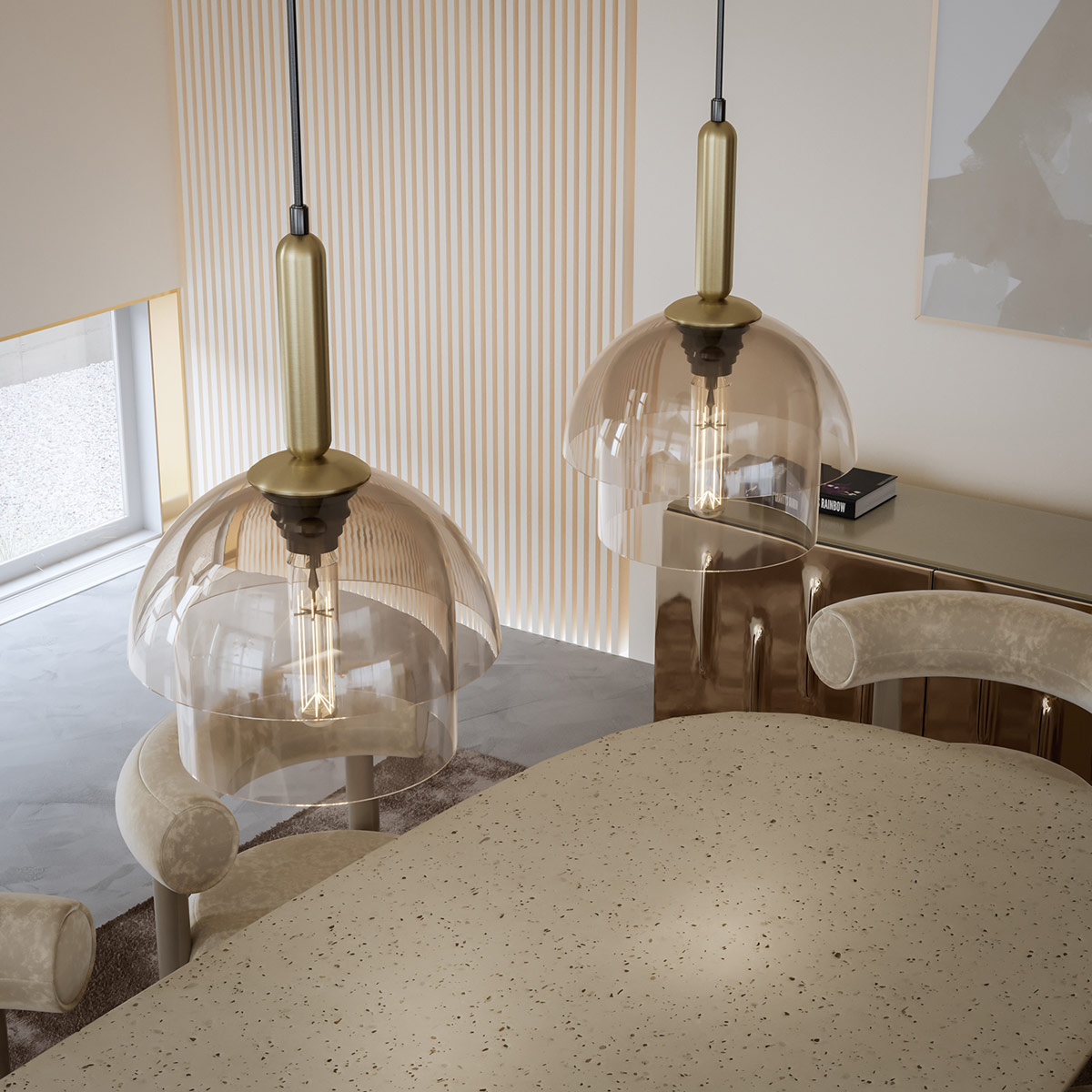 別致的黃銅和玻璃吊燈沿著時尚的跑道形餐桌的長度配對。圓背餐椅與餐桌的現(xiàn)代曲線相得益彰。