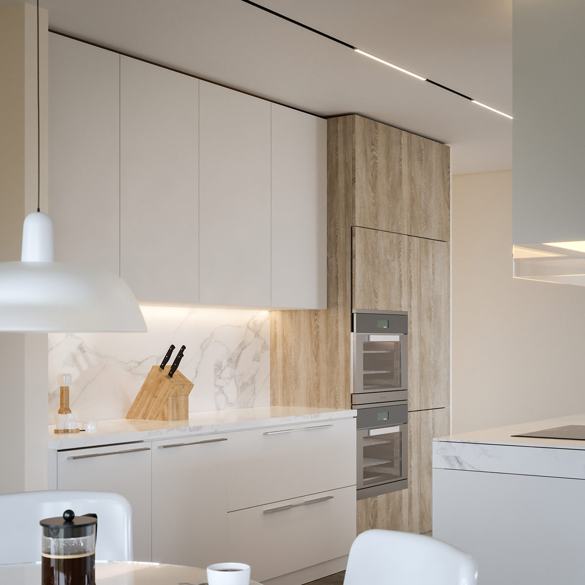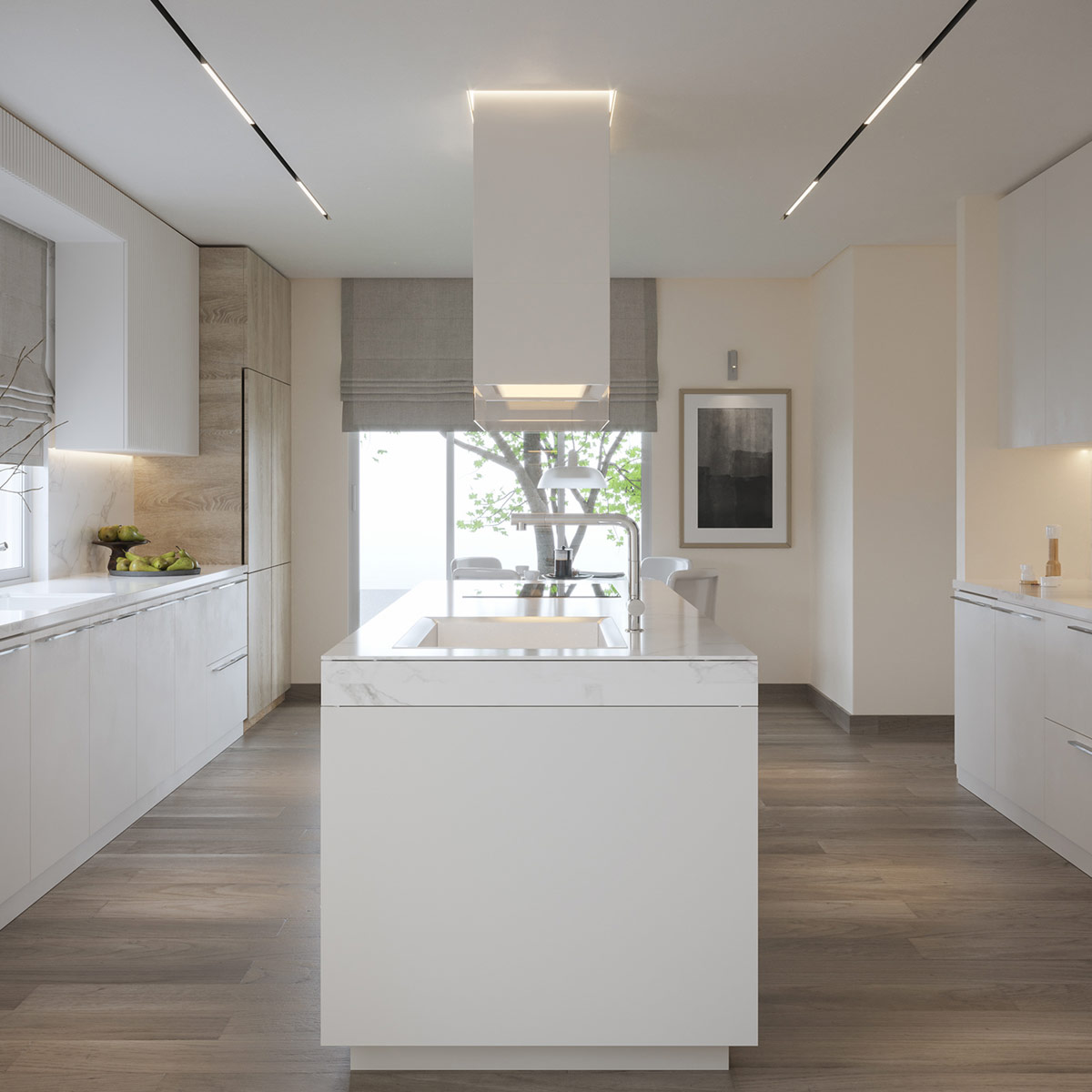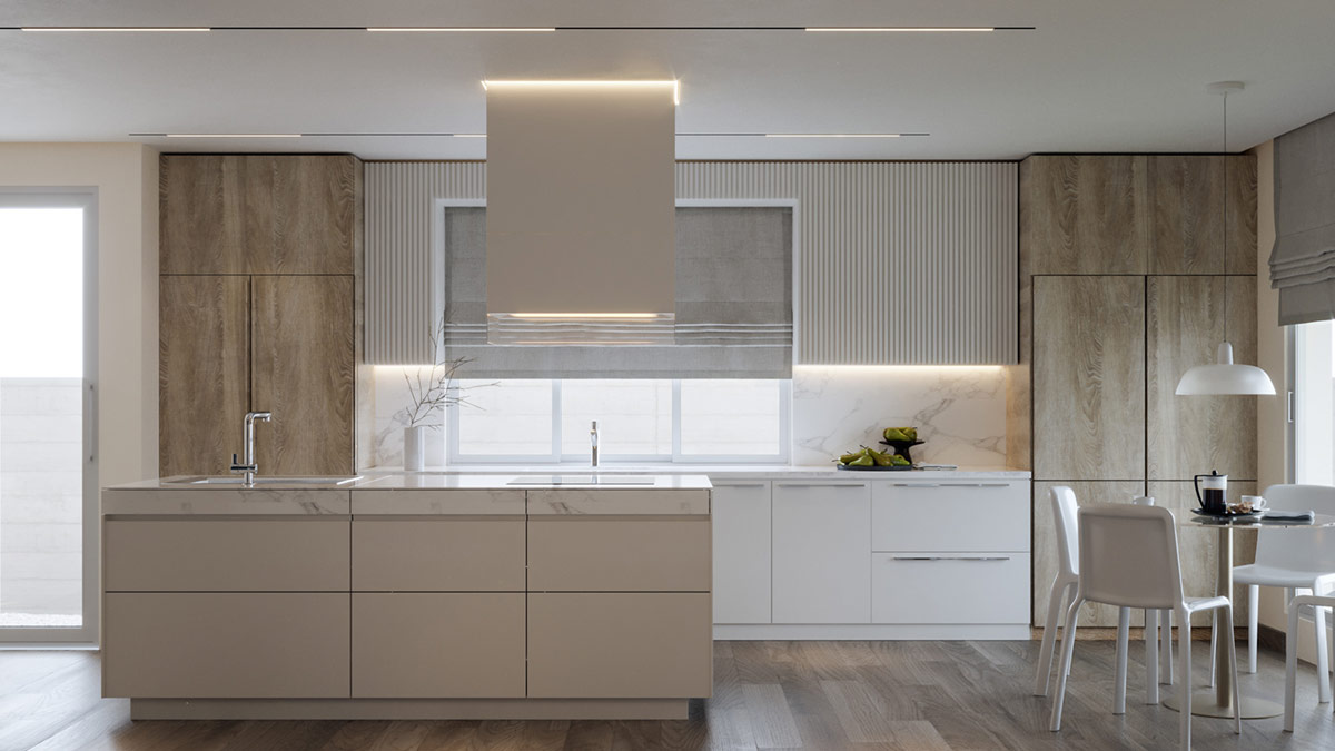 現(xiàn)代廚房采用干凈的白色和紋理木色調(diào)設(shè)計,配有時尚的米色廚房島臺。