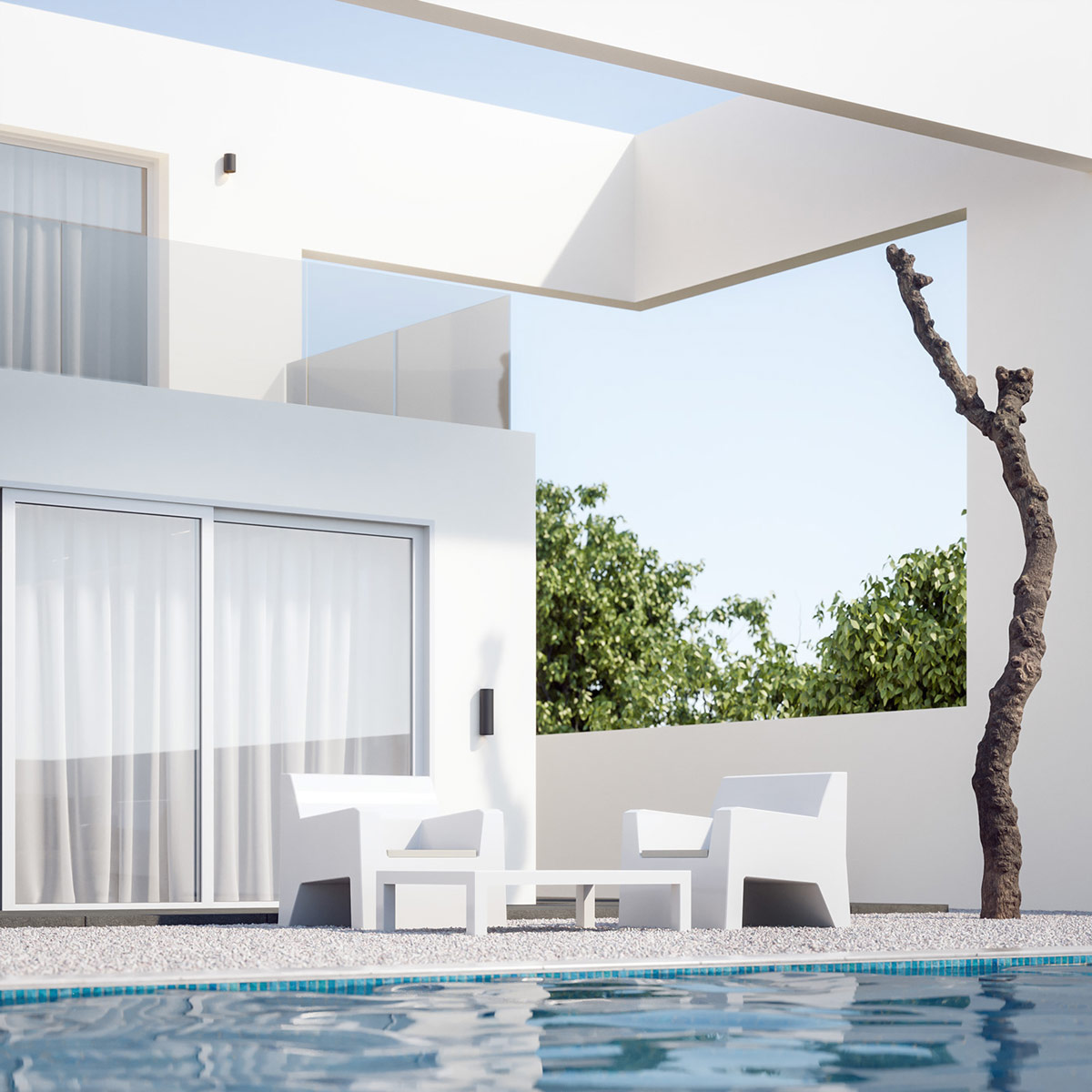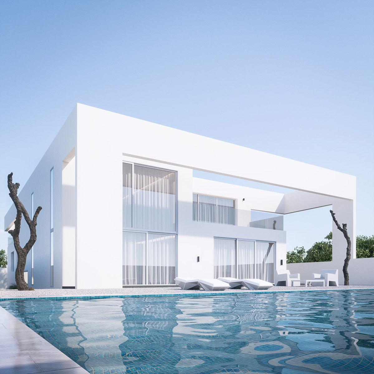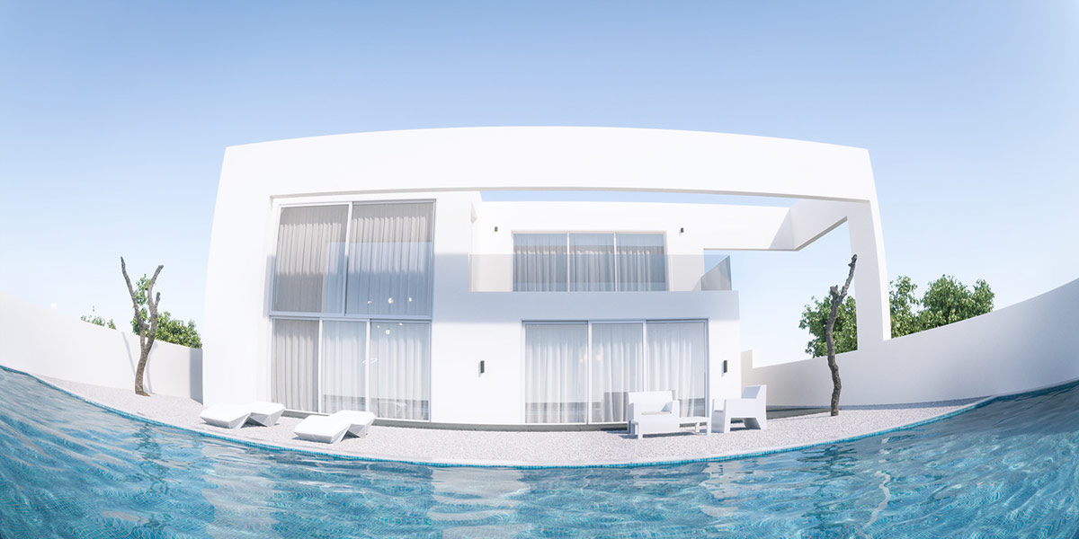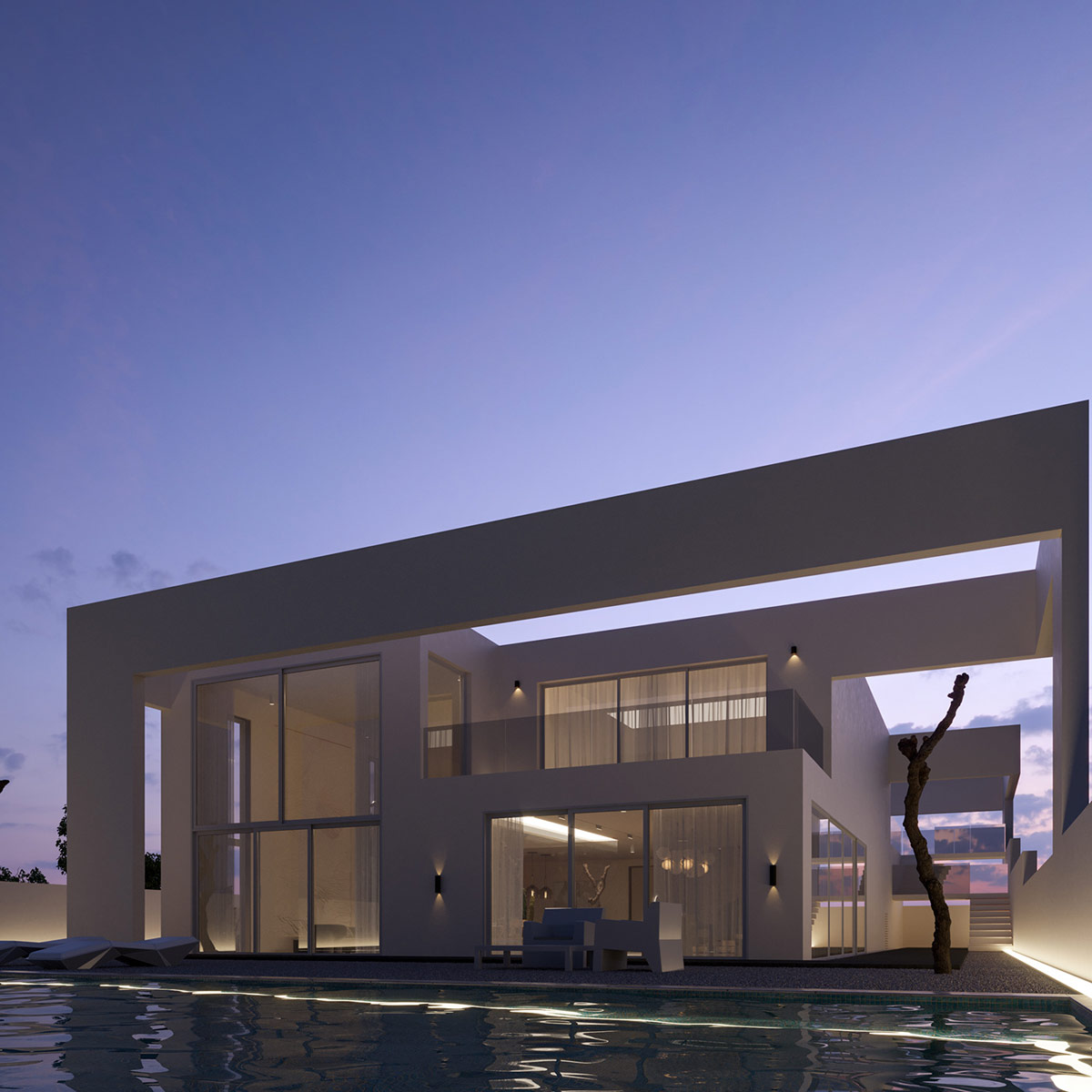 在現(xiàn)代家居外觀是一個線性的,白色渲染的體積,揭示了天空巨大的切除部分。