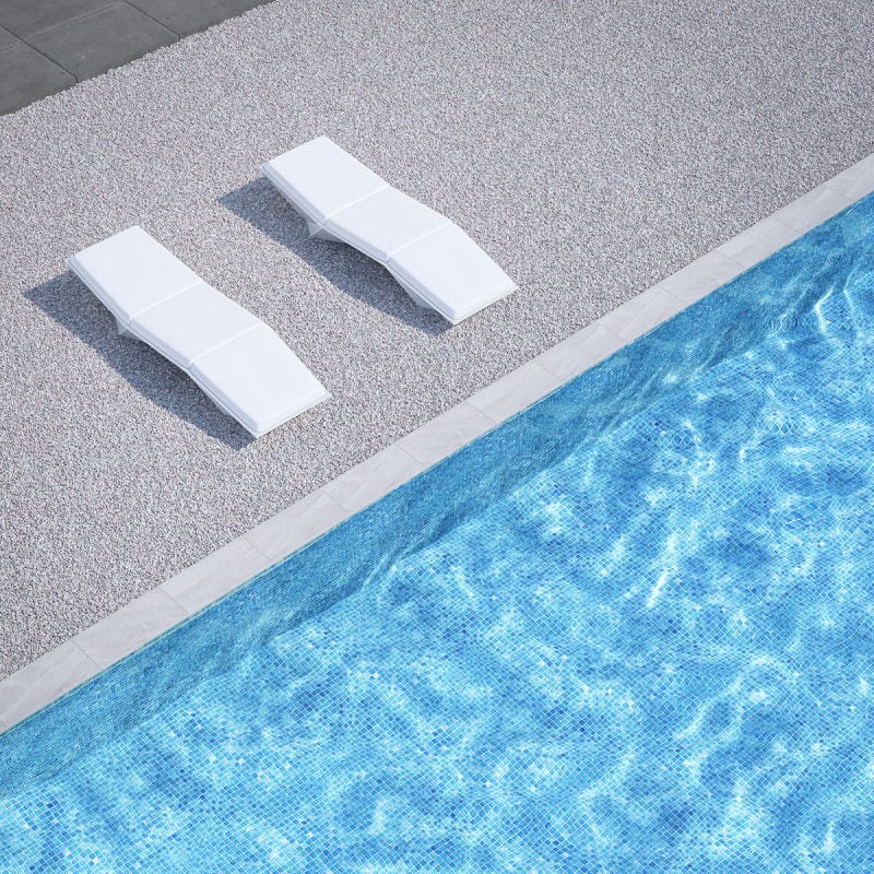 現(xiàn)代戶外椅子和咖啡桌是大型游泳池旁的休閑場所。