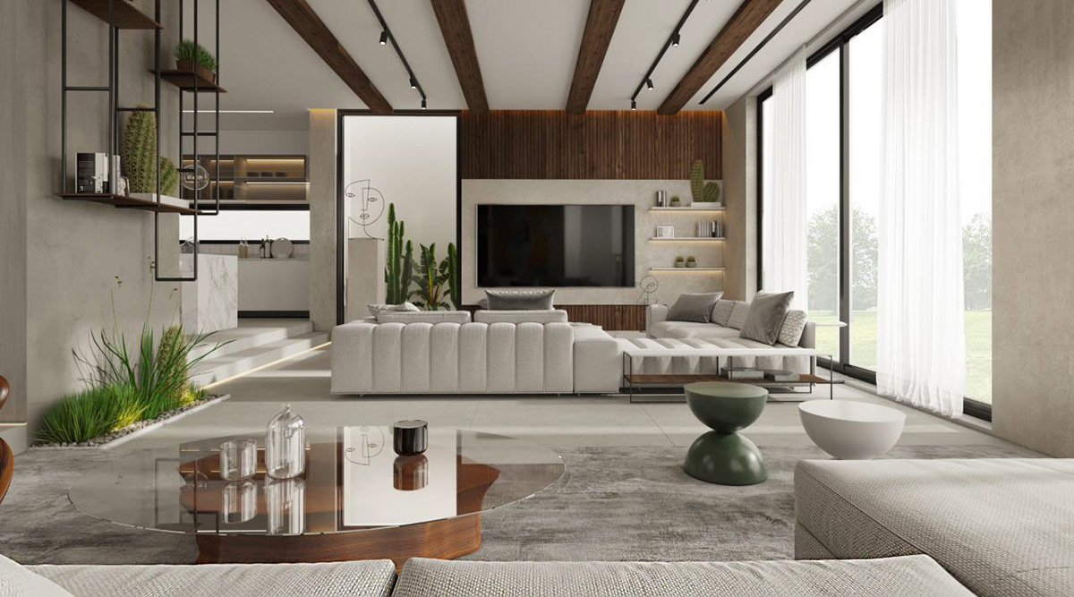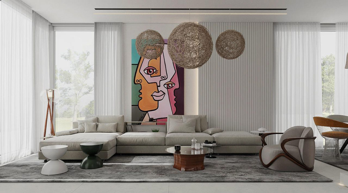 我們的第二個現(xiàn)代家居內(nèi)飾受益于大膽的色彩注入,在組合沙發(fā)上以抽象現(xiàn)代藝術(shù)的形式呈現(xiàn)。客廳的其余裝飾調(diào)色板是平靜的灰色和白色,讓藝術(shù)品真正閃耀。