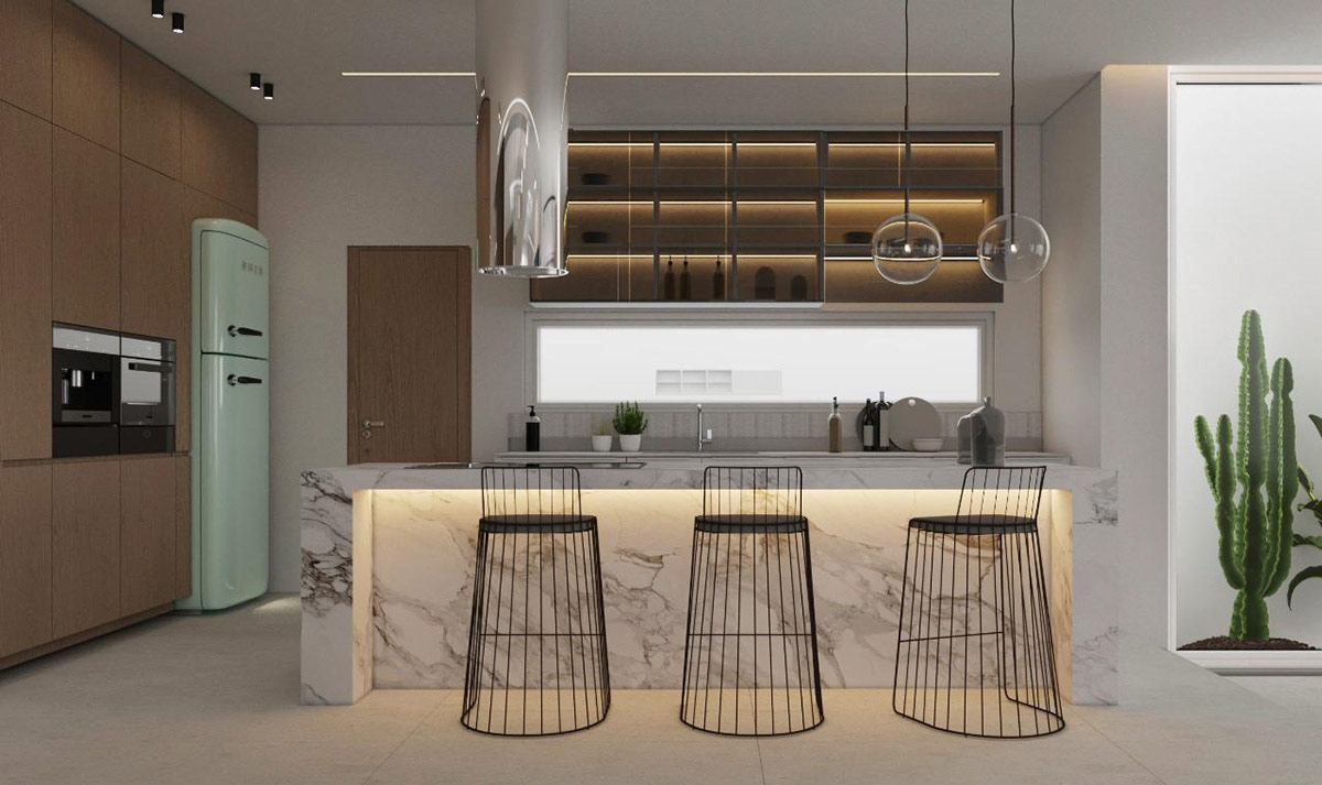 三個黑色金屬廚房吧臺凳與白色大理石島形成鮮明對比。一條 LED 燈帶照亮了令人驚嘆的大理石紋理。