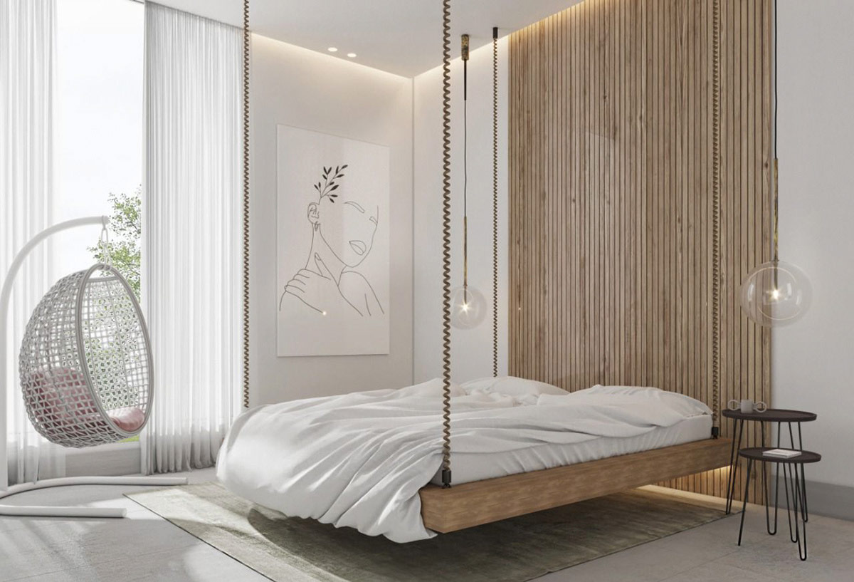 第二間雙人臥室采用獨特的懸浮床設(shè)計,配有現(xiàn)代木板條床頭板。一張秋千椅緊隨窗戶旁的懸掛主題,形成了一個誘人的閱讀角。
