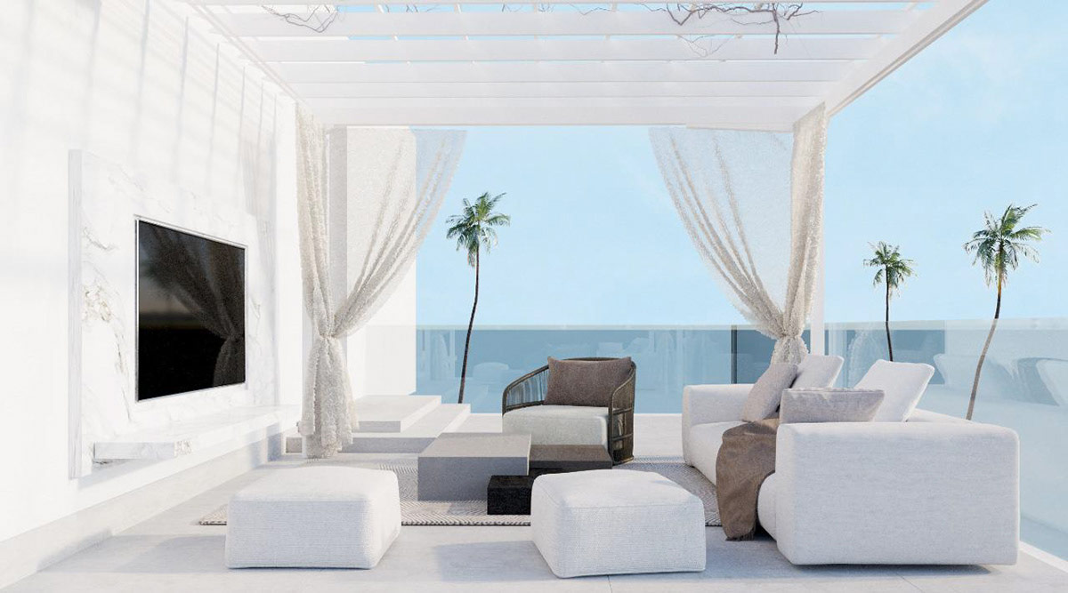 在陽臺上,可以拉上純白色的窗簾以防止蟲子進入,而房主則可以在新鮮空氣中享受小電視。白色大理石電視支架和媒體架營造出奢華的室內(nèi)外氛圍。清爽的白色軟墊家具展現(xiàn)出夢幻般的空靈美感。